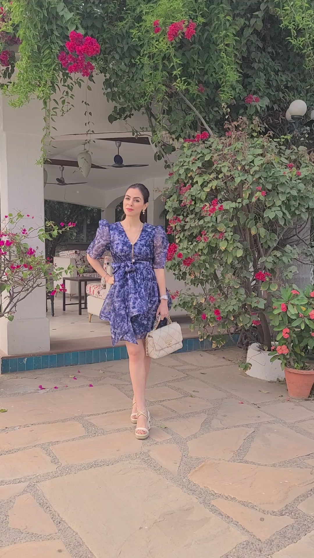 Featuring an all over floral print in a silk-organza blend, this crisp structured mini dress has intricate pleating under-yoke in a unique combination-silhouette. It combines a pencil-skirt fit under a peplum style skater-skirt with exaggerated knot detail at the waist. The plunging neckline and short sleeves in floral artwork in silk organza fabric infuse this piece with joyful colour. The knot can be tied at the back or the side for a cinched look. The dress can be customized for varying lengths and sizes
