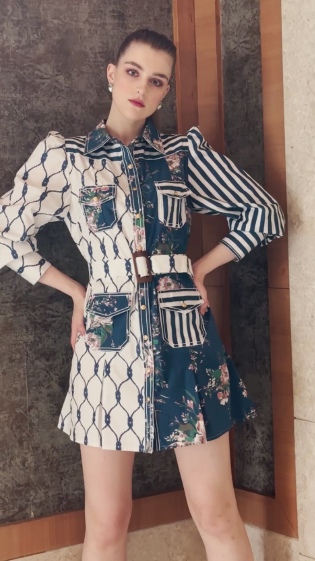 A unique play on Colour Block play – this stylish Shirt Dress is made from multiple panels of geometric & floral prints. Featuring a classic collar, front button fastening, embossed buttons, detachable belt, long sleeves, buttoned cuffs, two button-fastening chest pockets and two button-fastening pockets . The 2-Tone pockets are arranged in a 2x2 grid with Gold Tone buttons and a matching fabric belt. This Shirt Dress is made to measure & the length can be customized as per your height.