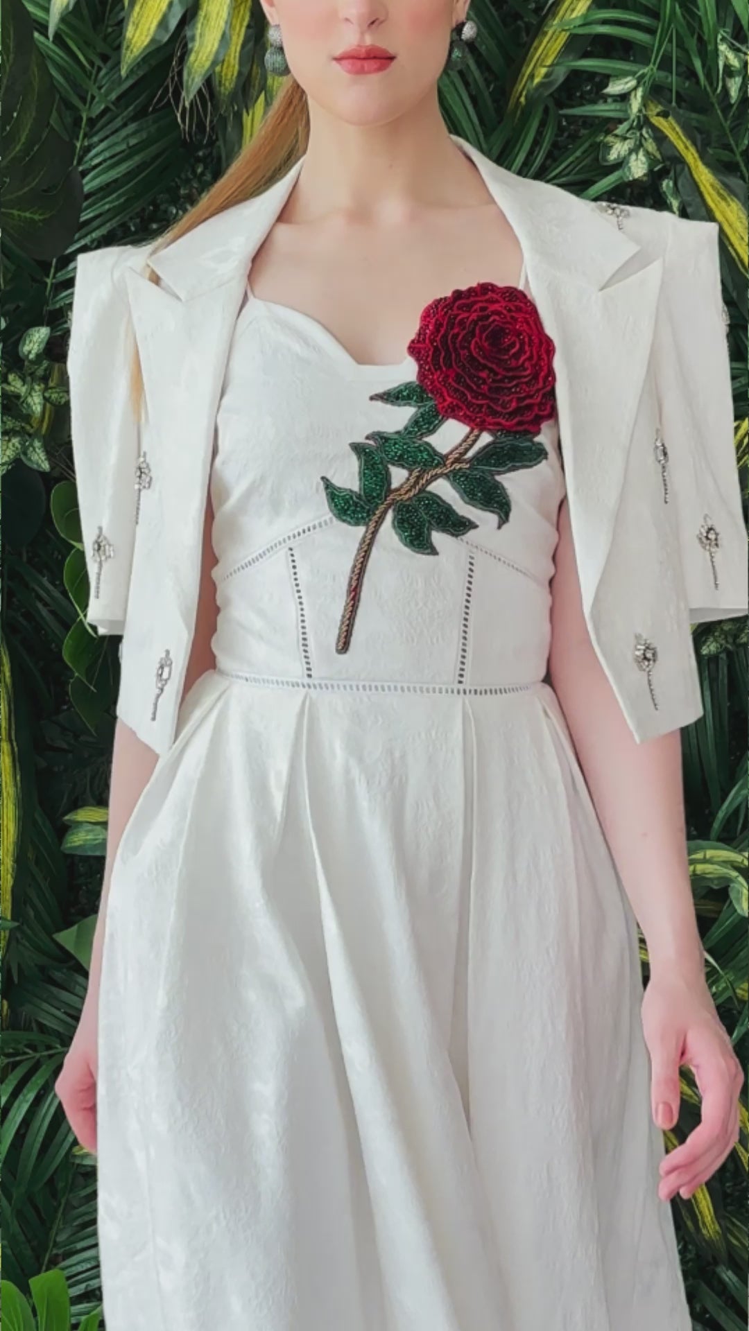 The benefit of a structured dress is that it does the hard work for you! By itself, your dress brings poise, allowing you to relax. Featuring our A-line Midi Dress with Rose Sequin Embroidery on the yoke with lace bidding details. The noodle straps add a touch of playfulness to the dress, while the flared hemline is flattering for all body types.